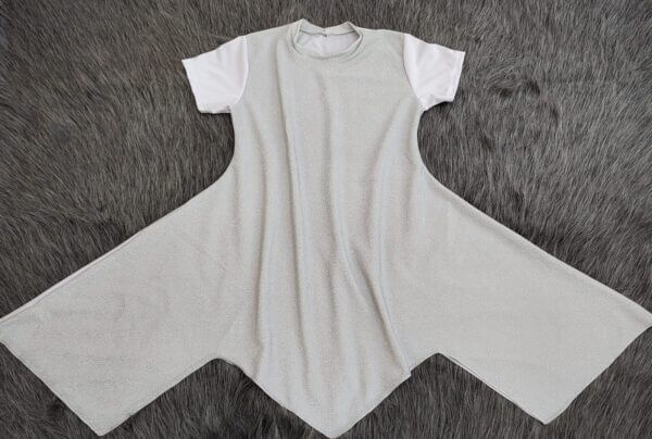 No modelo masculino a bata é sem pontas e cintura reta